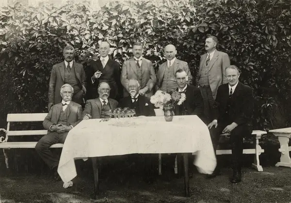 Oslo bygningskommisjon, gruppe, menn, befaring hos direktør Diesen på Kværner Brug, bord, glass