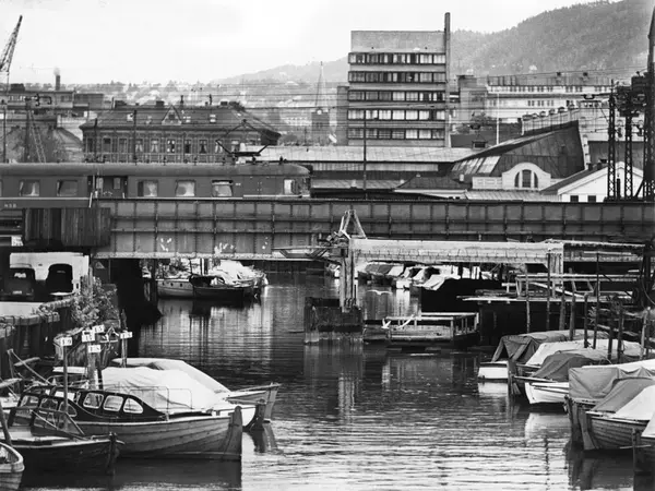elv, småbåthavn, jernbanebro, togsett, forretningsgård, bygårder