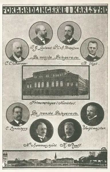 montasje: forhandlingene i Karlstad, portretter av de norske delegerte, frimurerlogen, byprospekt