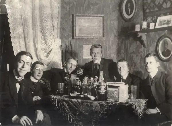 interiør, studenthybel, gruppe, menn, studenter, fest, pjolterlag, brennevinsflasker