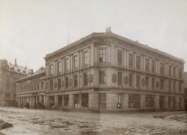 Gunerius Pettersen magasin, forretningsgård, gate, brostein, vårslaps
