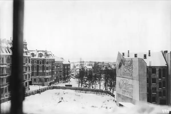 utsikt, gateløp, bygårder, gavlreklame, tomt, plankegjerde, snø