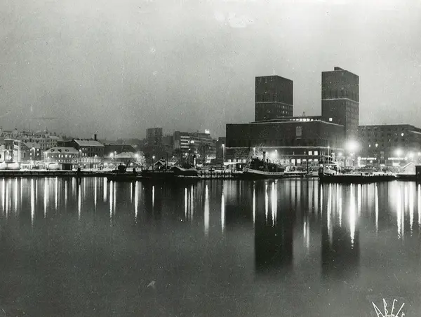 fjord, havn, fjordbåter, Rådhuset, bygårder, kontorbygninger, snø, nattemørke