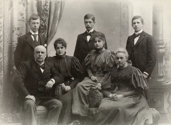 familiegruppe, mor, far, barn, sittende og stående helfigur