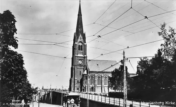 Bildet er tatt tidligst 1898, men neppe seinere en sommeren 1909. Trikken har ikke linjenummer som ble innført i september samme år.