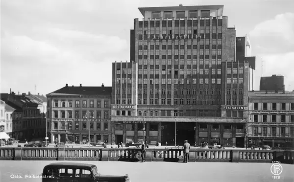 Folketeaterbygningen, kontorbygning, forretningsgårder, mennesker