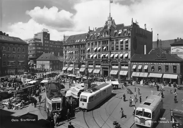 torg, torghandel, mennesker, trikker, buss, biler, portrettstatue, pissoir, forretningsgårder