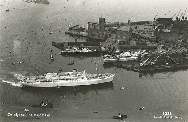 I forgrunnen SS Oslofjord, ved N. A. L.'s kai SS Bergensfjord og ved utstikker II MS Kronprins Olav (DFDS). Bildet er fra en av de siste dagene i mai 1938 da SS Oslofjord kom til Oslo for første gang.