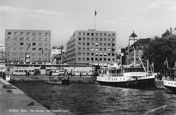 havn, dampbåt Oscarsborg, plass, bussholdeplass, busser, mennesker, kontorbygninger