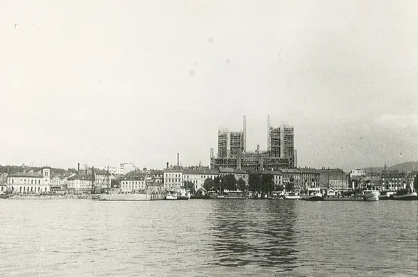 fjord, havn, båter, Rådhuset, byggevirksomhet, stillas, bygårder, Vestbanesatsjonen