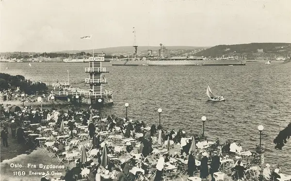 Bygdøynes bad, frilufterestaurant, badestrand, stupetårn, mennesker, badeliv, fjord, marinefartøy, britisk slagskip HMS Rodney