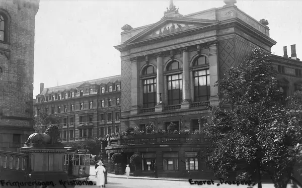Stortingsbygningen, løveskulptur, Frimurerlogen, friluftsrestaurant, trikk, forretningsgård, mennesker