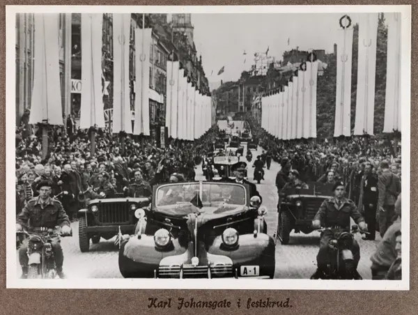 feiring av frigjøring og fred, bilkortesje, bil A-1, konge, motorsykler, publikum, bannere