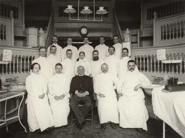 Første rekke fra venstre: Julie Bang-Hansen, Axel Einar Bødtker, Julius Nicolaysen, Ingjald Reichborn-Kjennerud, Otto Knoph Rømcke Gulowsen. Annen rekke fra venstre: Aksel Odd Dines Haneborg, Peter Normann Meyer, Anders Mikal Smedsrud, operasjonssøster "Mina", sykevokter "Nils", Henrik Resch, Nils Henrik Elstrand Friis. Tredje rekke fra venstre: Peter Elisæus Marstrander, Christian Johannes Brodtkorb, Harald Peutz Borgen, Staal Olaf Eggen, Frithjof Valeur.