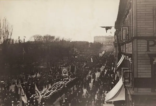gateløp, hotell, 17. mai-feiring, 17. mai-tog, sangkor, faner, flagg, mennesker, Fritzners paviljong, Slottet