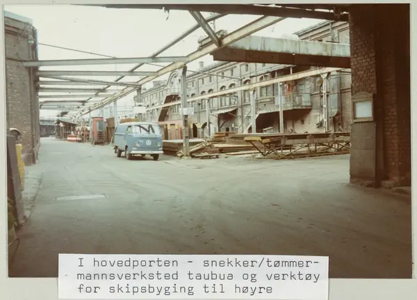 Nylands Verksted, gårdsinteriør sett fra hovedporten, snekker- og tømmermannsverksted, taubu, verktøy for skipsbygging, varebil, Volkswagen Transporter, telefonkiosk