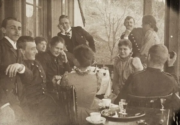 Fra venstre: Henrich Steffens, Robert Shaw Melhuus, Theodora Fay Klingenberg, Aimée Thaulow Knutsen Frølich, Borghild Hesselberg Gram, Theodor Christian Brun Frølich, Mally Thomsen, Hans Werner Jacobsen, Bokken Lasson, Olaf T. Klingenberg Bildet er tatt på verandaen til Gjestgiveriet, idag Sandviksveien 155.