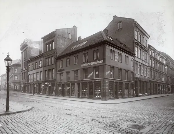 bygårder, hjørnegård, hattemaker M. Olsen, frøken Holmgrens damefrisørsalong, Wolffs parfymeri, gatebelysning