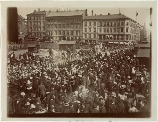 torg, 17. mai-feiring, mennesker, 17. mai-tog, flagg, fontene, bygårder, Folkets Hus