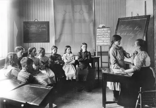 Kristiania offentlige skole for døve, interiør, elever, jenter, kvinne, lærer, undervisning, tavler