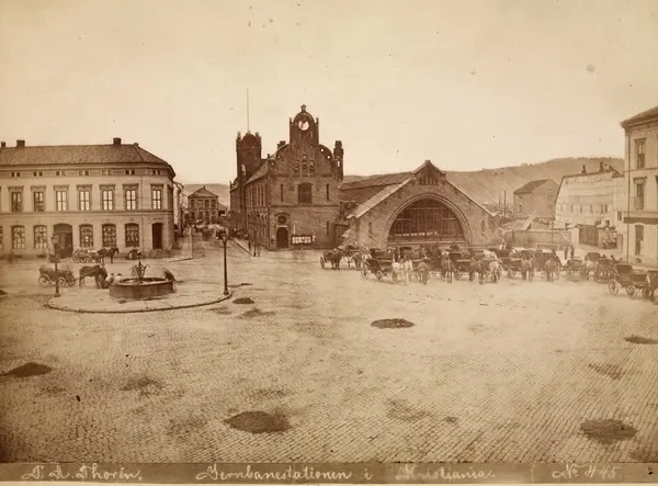 torg, jernbanestasjon, bygårder, hestekjøretøyer, fontene, gatebelysning