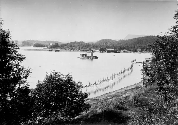 Holmen "Danmark", som nå ligger tett opptil E-18 som går på bro der fiskegarnene henger til tørk. Kadettangen bak. Tårnet på Kjørbo gård skimtes til venstre. Skaugumsåsen til høyre.