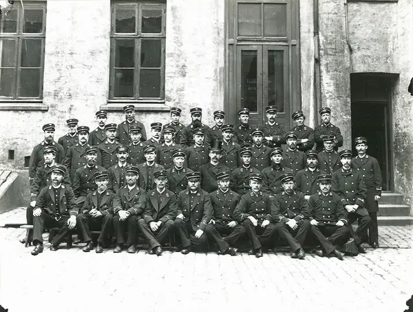 Fotografert i gårdsrommet til hovedpostkontoret i Karl Johans gate 14, 1883. På denne tiden var det ca 40 postbud i byen. Ytterst til høyre i bakerste rekke står Hans Doxrud, Kristiania Postbudsforenings første formann.