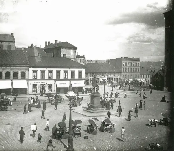 torg, mennesker, torgkoner, parasoller, torghandel, forretningsgårder, gatebelysning