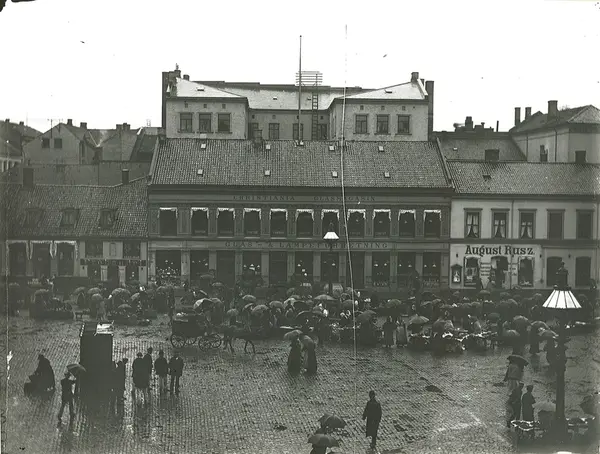 torg, mennesker, paraplyer, regnvær, torghandel, forretningsgårder, gatebelysning