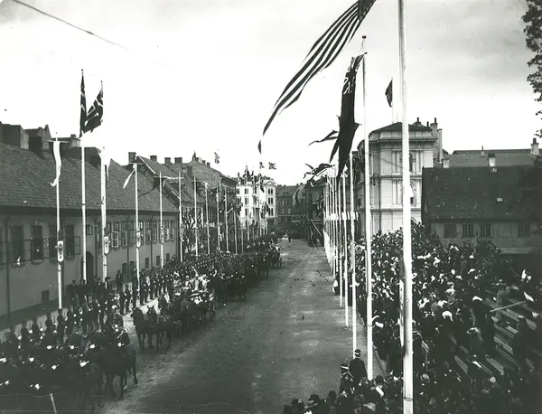 gateløp, Paleet, forretningsgårder, kong Oscar IIs regjeringsjubileum, flagg, mennesker, prosesjonen forlater Østbanestasjonen, hester, mennesker