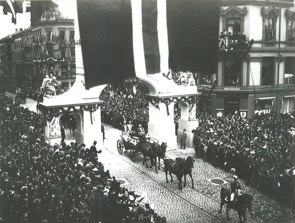 gateløp, forretningsgårder, pyntet til kong Oscar IIs regjeringsjubileum, portal, portal, hestekjøretøy, flagg, mennesker