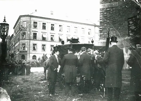 Henrik Ibsens begravelse, Trefoldighetskirken, vogn, kiste, hester, menn, bygård