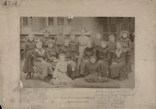 Stående fra venstre: Drude Daae Magelssen, Ragnhild Wiel Nilsen, Sonja Kjerschow, Gunvor Bjørnstad, Oelgard Eleonora Theodora Erica von Ditten, Dagny Knutsen, Julie Abild, Lillemor Andersen. Sittende fra venstre: Constance Wiel Nygaard, Meta Hansen, Gunvor Holbye, Ingrid Hirsch, Ovidia Olafsen, Aagot Dons. På gulvet: Asta Pedersen, Ragnhild Wang. Legg merke til jentene i vinduene bak klassen.