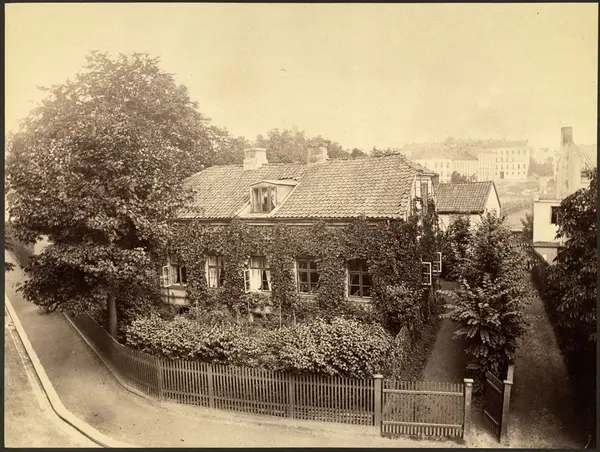 På baksiden: "Her bodde skoledirektør Halvor Hansen (Østenstad) med kone, 7 barn og hushjelp." Bygårdene i bakgrunnen er Falbes gate 16 og 18, samt Sofies gate 10 og 9.