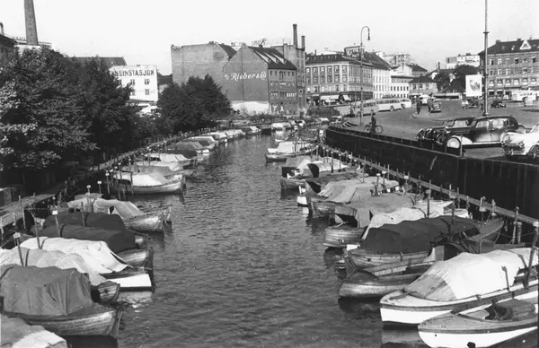 elv, småbåthavn, parkeringsplass, busser, biler, bygårder, fabrikkbygninger