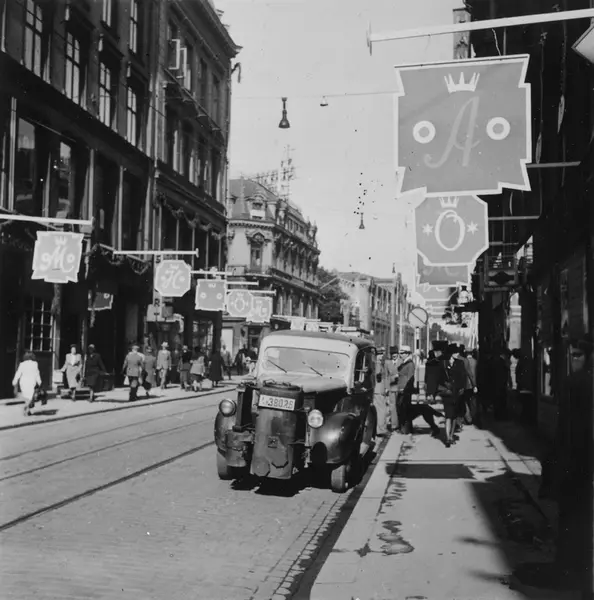 Karl Johans gate pyntet til kong Haakons hjemkomst, forretningsgårder, bannere med kongelige monogrammer, mennesker, bil, vedgenerator