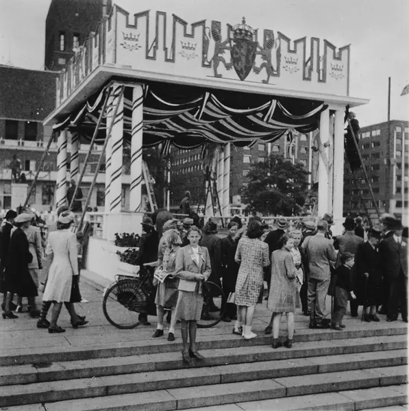 æresportal på Rådhusplassen ved kong Haakons hjemkomst, mennesker, Rådhuset, kontorbygninger