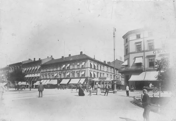 plass, Søstrene Larsens hotell, Grand Hotel, balkong, markiser, gateliv, hestesporvogner, mennesker