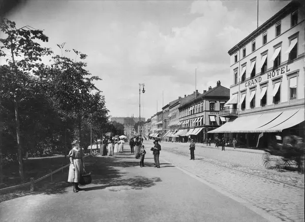 gateløp, Grand Hotel, Søstrene Larsens hotell, bygårder, mennesker, park, promenade, gatebelysning, Slottet