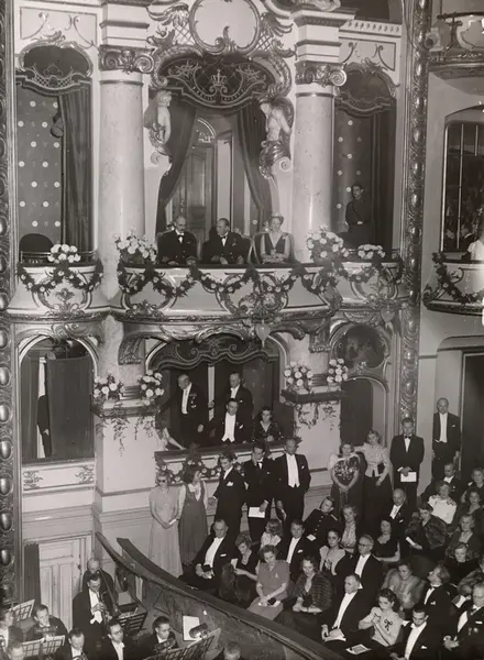 Nationaltheatret, interiør, publikum, kongelosje, konge, kronprins, kronprinsesse, festforestilling for kongehuset, musikere