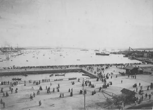utsikt, havn, mennesker, keiserbesøk, småbåter, seilfartøyer, dampskip, Akers mek. Verksted