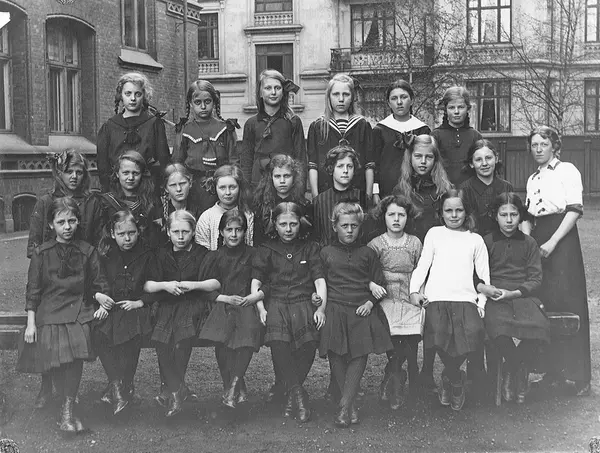 Vestheim pikeskole, gruppe, klasse, jenter, kvinne, lærer, bygård