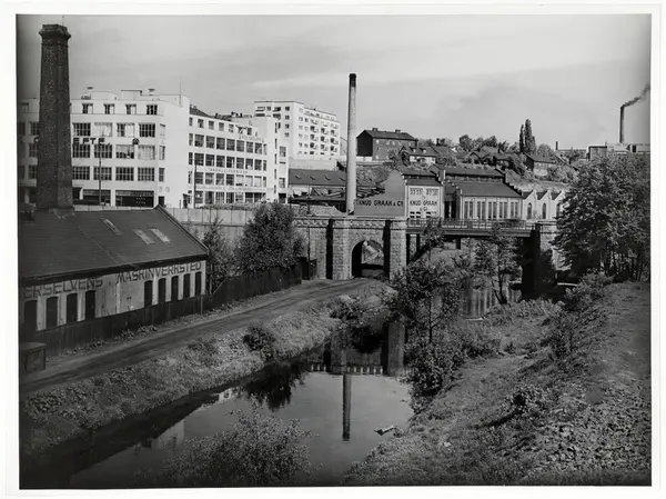 elv, fabrikkbygninger, Akerselvens maskinverksted, Tandhjulfabriken, bro, gangvei, boligblokk, trehusbebyggelse
