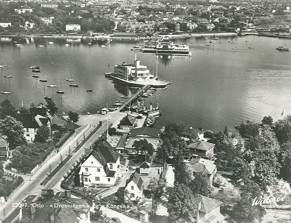 utsikt, villabebyggelse, Dronningen restaurant, Lanternen restaurant, Norske studenters roklubb, fjord, Kongen retaurant, seilbåter, bygårder