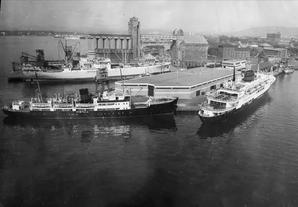 utsikt, fjord, havn, utstikker II og III, skip Vistula, skip Kong Olav V, skip Frierfjord, kornsiloer