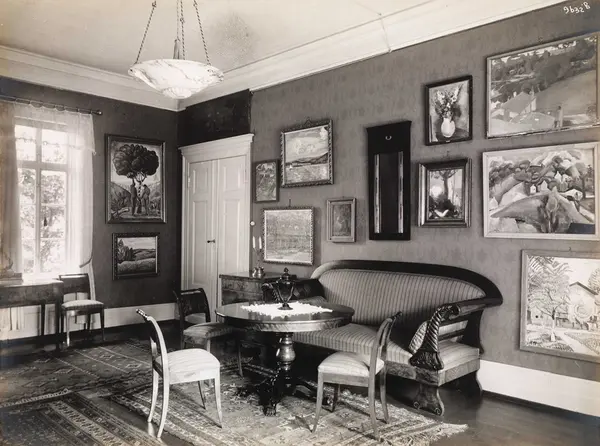 villa, interiør, stue, salong, biedermeiersofa, malerier