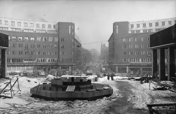 Rådhusets borggård, fontene, byggeplass, plass, biler, mennesker, kontorbygninger, gateløp, snø