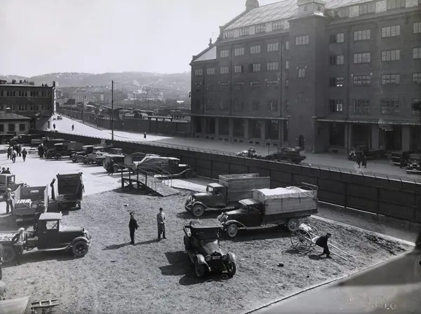 Oslo slaktehus, gårdsplass, menn, lastebiler, Oslo Tollsted, bensinstasjon