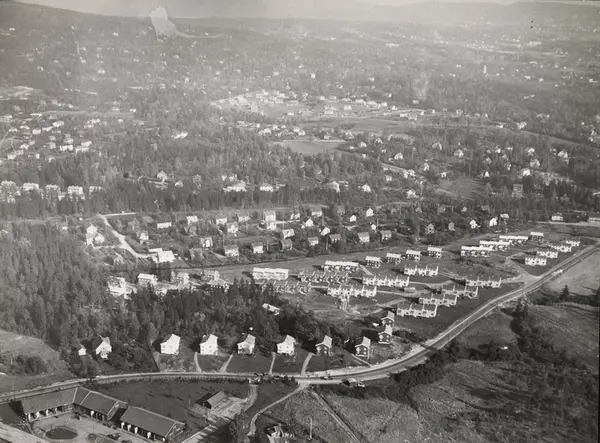 Husebygrenda borettslag. Kirkeneslærernes borettslag, stiftet 1945 av lærere som ble sendt på tvangsarbeid i Kirkenes i 1942 fordi de nektet å gå inn i det nazistiske lærersambandet. Gardeleiren nederst og husmannsplassen Teigen midt på bildets nedre kant. Grenda bortenfor er Øvre Smestad vei, bygget i 1924-25 av Bondeungdomslaget, derfor kalt "Lefsegrenda" på folkemunne.