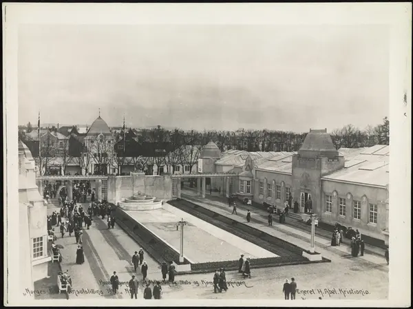 Jubileumsutstillingen 1914, plass, basseng, mennesker, Stats- og Kommunebygningen, skulptur Helhesten, hovedinngang, villabebyggelse